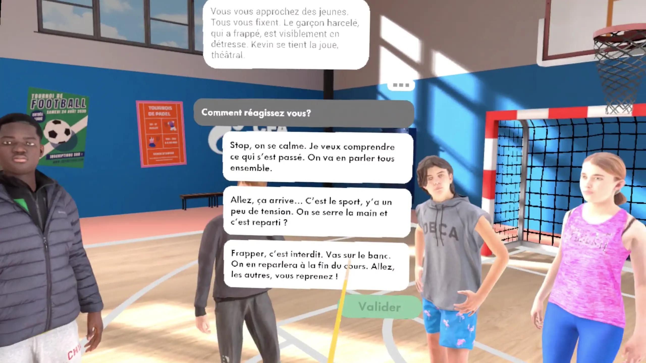 Dans ce module VR harcèlement, l’apprenant incarne un encadrant sportif lors d’un stage multisports. À travers des scénarios interactifs à choix multiples, il doit repérer les premiers signes de harcèlement, prendre des décisions, dialoguer avec les jeunes, les collègues et les parents. Chaque choix a des conséquences visibles : escalade, résolution ou aggravation de la situation.